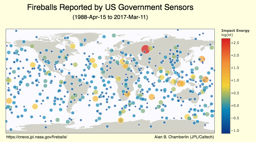 To study the threat of various impacts, a team simulated 50,000 impacts with asteroids ranging 15 – 400 meters in diameter.1 These are the most common size for potentially threatening impacts. They then looked at how many lives might be lost not just from the impact, but from secondary factors such as explosive air bursts and tsunami. What they found was that land impacts were an order of magnitude more dangerous than water impacts. They also found that the most dangerous aspects of an impact were not the actual impact location and resulting debris, but rather the heat and explosive pressure changes that occur in the surrounding area. This was exactly what happened with the meteor near Chelyabinsk in 2013, where the air blast caused most of the injuries.