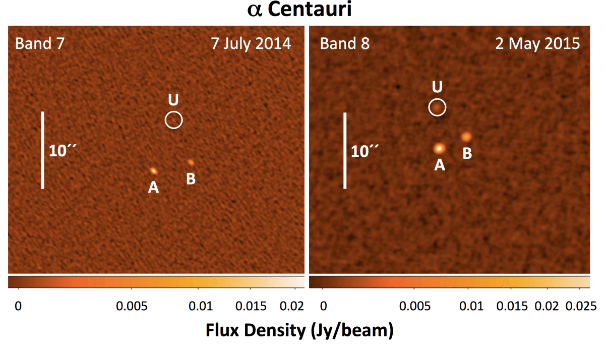ALMA is capable of precise observations at short microwave wavelengths, typically emitted by cold gas and dust. But objects on the edge of our solar system also emit light in this range, and would be too cool and distant to be observed by infrared telescopes. In 2014, ALMA found a faint object in the direction of Alpha Centauri A & B. The object was again observed in May of this year, this time more clearly. Given that the object is within a few arcseconds of the Alpha Centauri system, it would seem reasonable to presume that it could be part of that system, possibly gravitationally bound as Alpha Centauri D. The Centauri system is about 4 light years away, and at that distance (given the object’s brightness at submillimeter wavelengths) it would have to be a red dwarf star. But such a star would also be clearly visible in the infrared, so if this object is Alpha Centauri D we should have seen it long ago.