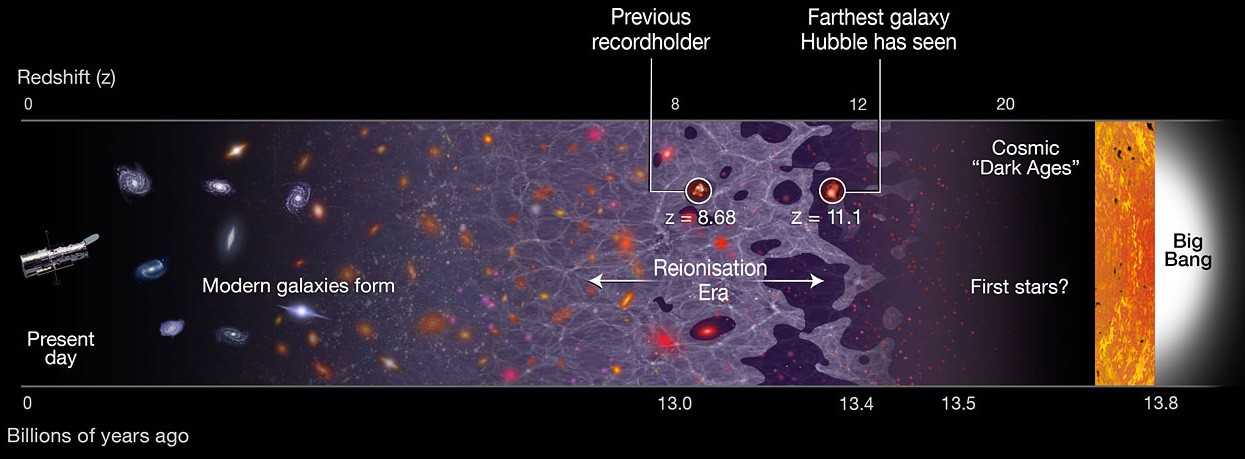 NASA/ ESA/ P. Oesch (Yale University)The thing about records is they keep getting broken. Take, for example, the record for the most distant known galaxy. In October of 2013 the most distant galaxy had a redshift of z = 7.51. In February of 2015 we found one at z = 7.73, then one at z=8.86 in late 2015. Now there’s a new record at z=11.1.1