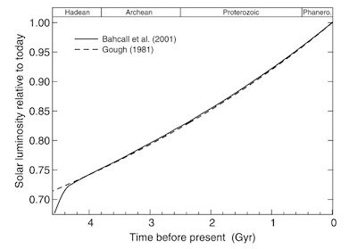 NASA/GSFC/CILAlthough the Sun seems ageless and never changing, it is a star like any other. It’s only a bit older than the Earth itself, and like every star it formed from the gas and dust of a stellar nursery. As we’ve come to understand stellar evolution, it has become clear that stars get warmer as they age. Billions of years ago, our Sun was about 70% as luminous as it is today. That means young Earth received less heat from the Sun than it does today. So much less heat that it wasn’t enough to sustain liquid water. But geologic evidence clearly shows that there were oceans of water in Earth’s youth.