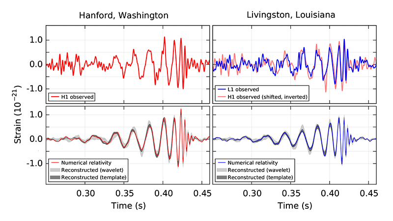 B. P. Abbott et alThe paper released today has been peer reviewed, which is comforting given the BICEP2 incident. It’s also a remarkably strong result given the extreme sensitivity necessary to detect gravitational waves. The advanced LIGO experiment consists of two detectors located in Louisiana and Washington. To qualify as a real detection, there must be a nearly simultaneous event in both detectors with the same basic form. In the above image, the event in question matches up quite well. It also matches the expected signal as calculated from numerical simulations of merging black holes. This is a strong, clear signal confirming gravitational waves.