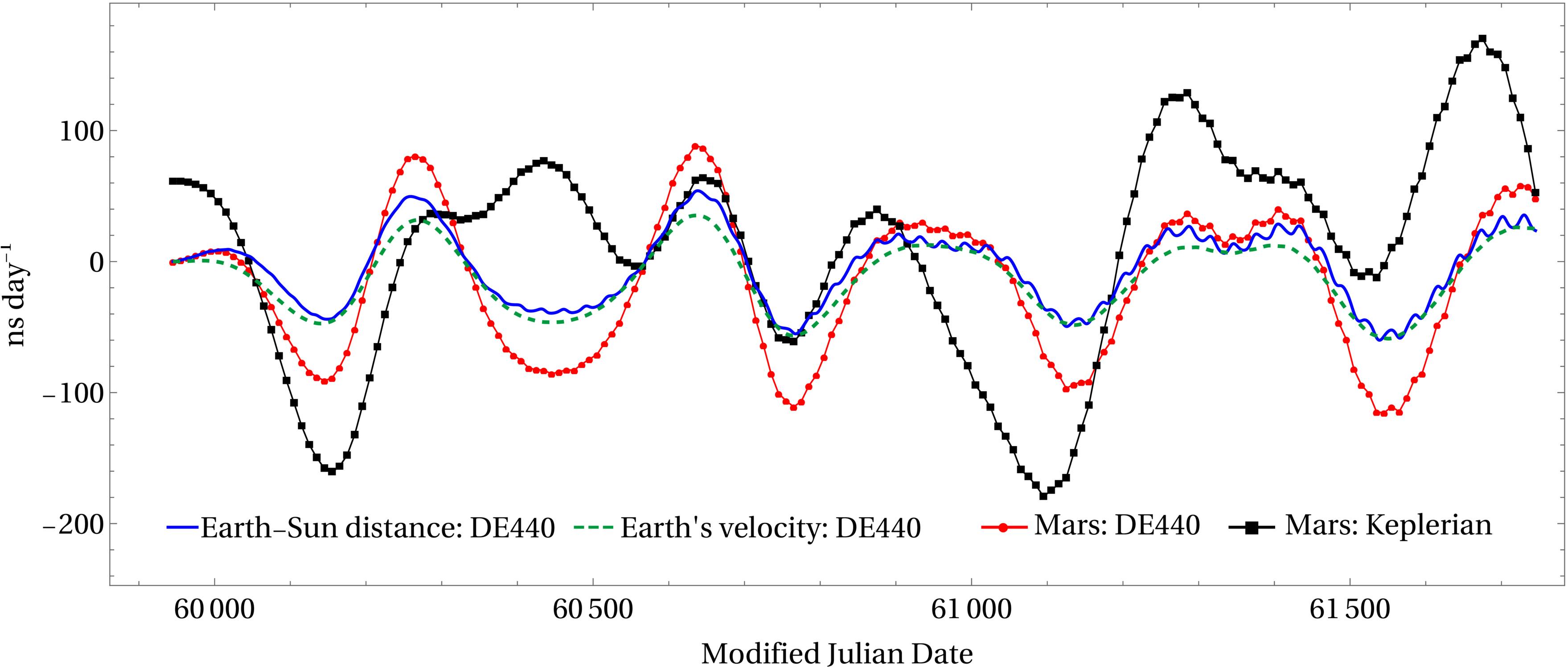 Ashby and PatlaTo begin with, the rate of time is affected by gravity. The stronger your gravitational acceleration, the slower your clocks. Since the surface gravity of Earth is about 3 times that of Mars, an atomic clock on Mars would tick faster by about 477 microseconds a day. And clocks are also affected by relative motion. Since the speed of Mars relative to Earth varies depending on where Earth and Mars are in their orbits, atomic clocks on Mars would vary by 226 microseconds. And then there is the travel time of light between the two worlds, which varies based on the distance between Earth and Mars.