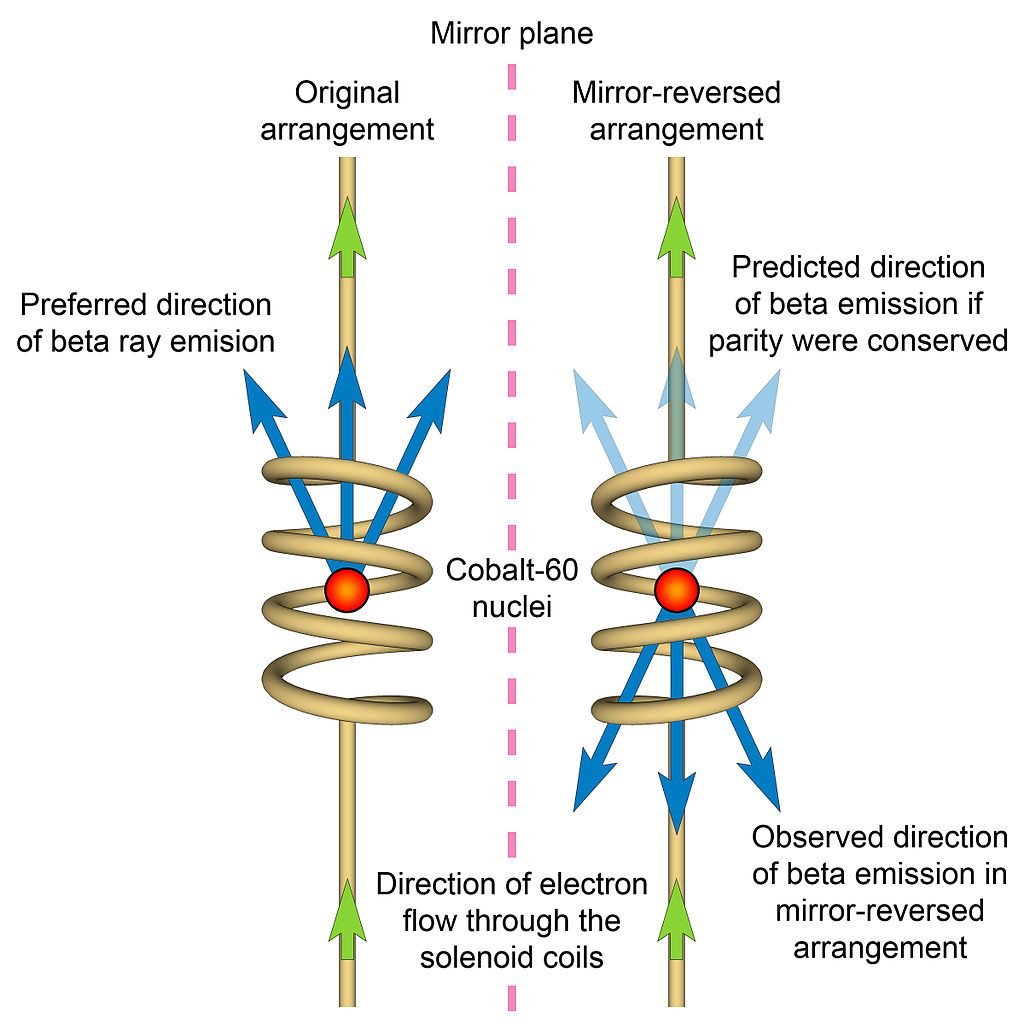 Wikipedia user nagualdesignAt least that would be the case if parity symmetry were true. While usually things are symmetrical under a switch of parity, there are some cases were parity is violated. This was first demonstrated by the Wu experiment in 1956.1 Chien-Shiung Wu looked at the radioactive decay of cobalt-60 atoms. If parity was conserved, then mirror image decay experiments should behave in exactly the same way. What she found was that mirrored experiments of cobalt-60 decayed in opposite directions. Since radioactive decay is driven by the weak nuclear force, this meant the weak force violates parity.