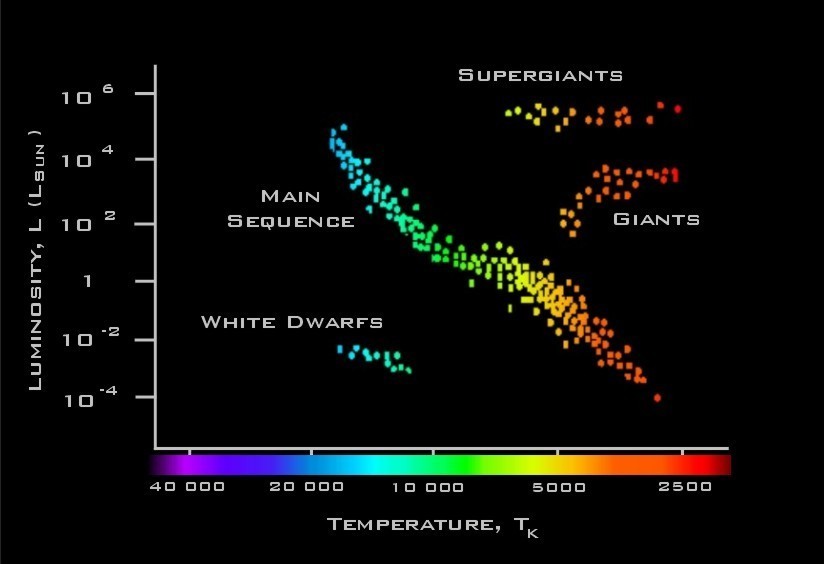 Stars along the main sequence follow a particular trend, where hotter stars tend to be brighter. That might seem like an obvious thing, but the diagram also showed hot but dim stars (white dwarfs) and cool but bright stars (red giants). What the main sequence really showed is that for most stars the more massive a star the brighter and hotter it tends to be. It was an indication that mass was an important factor in a star’s energy production. It was a bit of a surprise, since if stars shined simply due to gravitational collapse, one would expect age to be the main factor of brightness, not mass. The HR diagram led us to the understanding that nuclear fusion powered stars, aided by the extreme heat and pressure created by a star’s weight.