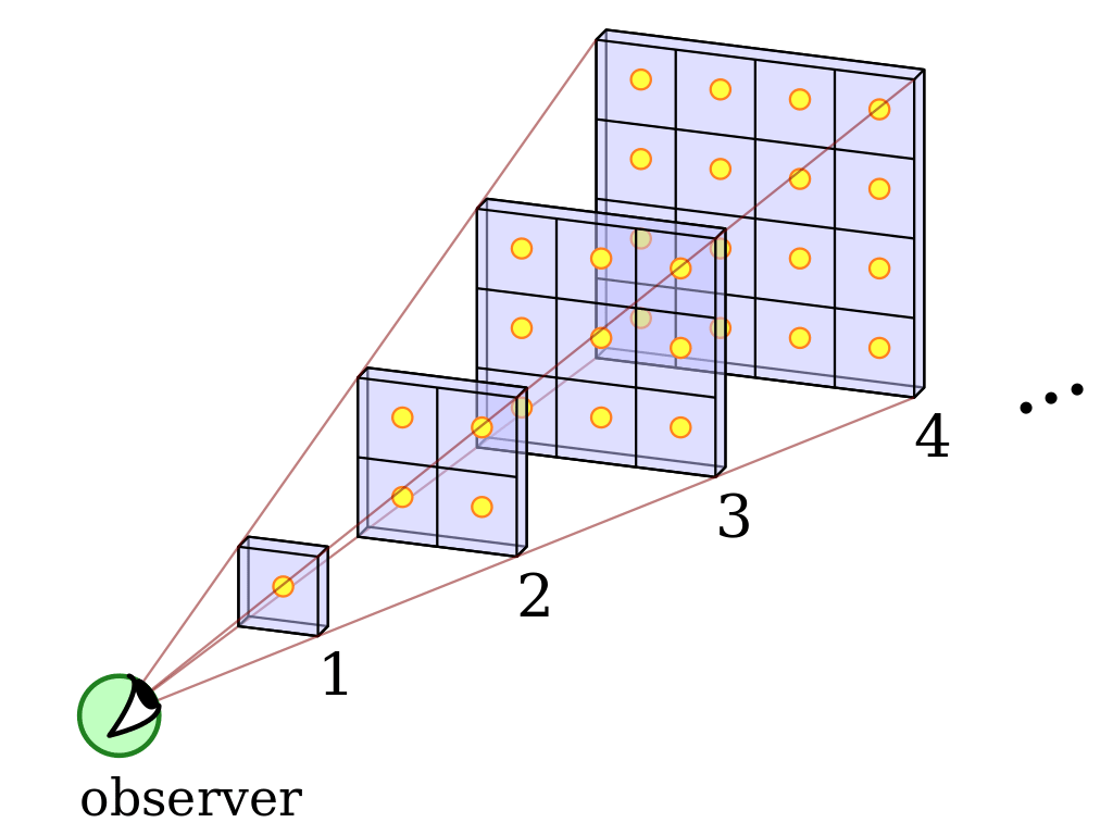 Wikipedia user HtkymThe first paradox is perhaps the most famous. Known as Olber’s paradox, it questions how an infinite ageless universe could be mostly dark. At first glance it might seem obvious. The more distant a star, the dimmer it appears, so stars very far away are simply too dim to be seen. But the apparent brightness of a star follows a specific relationship known as the inverse square law. A single star some distance away is as bright as four similar stars twice as distant, or nine three times farther away. But if stars are distributed fairly evenly, then there are four times the number of stars twice as far away, and nine times more that are three times away. So while stars appear dimmer with distance, there are more stars at greater distances. So an infinite ageless universe should have a sky as bright as the Sun.
