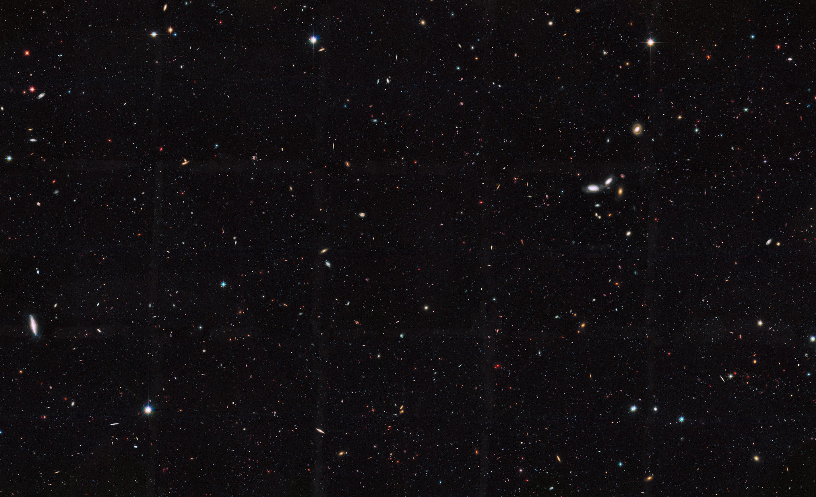 NASA, ESA, the GOODS Team, and M. Giavalisco (University of Massachusetts, Amherst)Suppose you picked up a single grain of sand and held it at arms length. The sand grain would cover just a tiny patch of sky. Now imagine you found the darkest patch of night sky you could find and looked long and hard at an area no bigger than that single grain of sand. In 2004 the Hubble space telescope did just that, observing a tiny patch of dark sky for a total of 55 hours. The image it produced is known as the Hubble Ultra Deep Field. It found more than 10,000 galaxies that were present when the Universe was just 400 – 800 million years old.