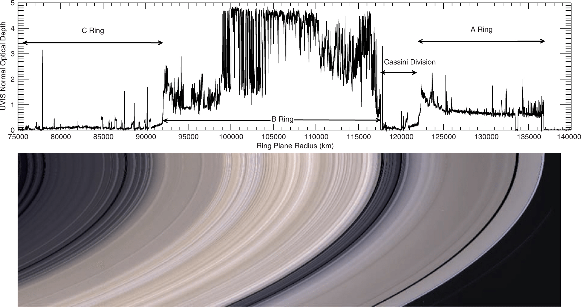 Cuzzi, et alStars have a known brightness, so when a star is seen passing through Saturn’s rings, the amount the light dims is a measure of how much light is absorbed by the rings. Known as the optical depth, it is a good measure of how thick and dense the rings are at different distances. This allows us to look for patterns that aren’t easy to see just by looking at the rings. While we’ve done this type of thing with stars as seen from Earth, Cassini has the advantage of watching different stars as their light passes through the rings at different angles, which gives us a much richer picture than Earth-based observations alone.