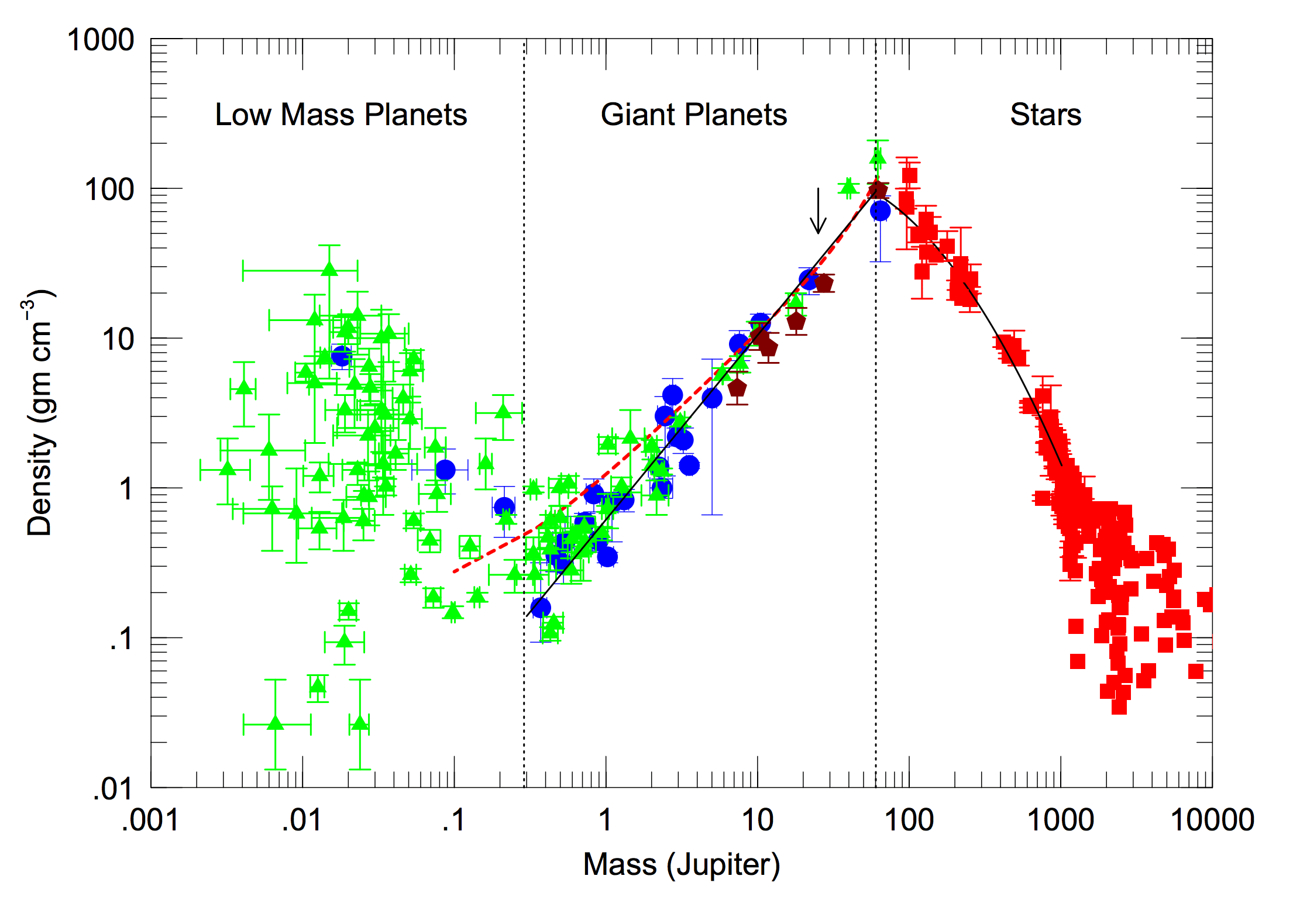 NASAAmong exoplanets that gap is filled. There exoplanets with masses of 2 to 10 Earths, and whether they are more like the jovian or terrestrial planets of our solar system remains a mystery. Right now we only know basic characteristics such as their mass and density. But that might be enough to divide them into two broad groups. Plotting the density of known exoplanets vs. their mass, there seems to be a clear split between low mass and high mass planets. Below about 0.3 Jupiter masses (95 Earth masses) the densities vary widely. This is indicative of the fact that planets of this size can be rocky (Mars), icy (Pluto-like) or gaseous (Neptune). In this regime the composition of a planet greatly affects its density. Above 0.3 Jovian masses, the composition of a planet is dominated by hydrogen and helium, similar to Jupiter. Because of the properties of hydrogen and helium, the size of these planets are all roughly that of Jupiter. The bigger the mass, the more the hydrogen and helium compress under their own weight, so the density increases with increasing mass. Around 60 Jupiter masses, the density once again starts dropping. This is due to the fact that above this mass a body has enough heat and pressure within its core to undergo fusion. As a result the body heats and expands significantly, thus decreasing its density.2